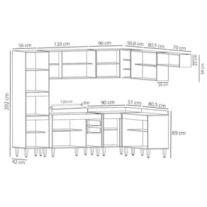 Conteúdo da Embalagem: 1 Balcão 120cm, 1 Tampo 120cm, 1 Armário Aéreo 120cm, 1 Armário Aéreo 70cm, 1 Armário Aéreo 80cm, 1 Balcão 80cm, 1 Balcão de canto, 1 Armário Aéreo de Canto, 1 Paneleiro.