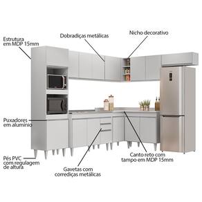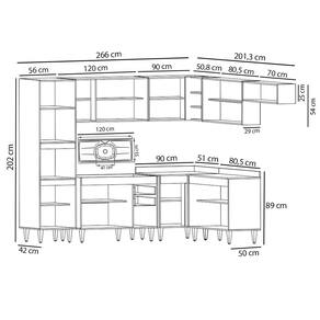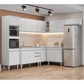 A começar pelo Paneleiro que conta com espaço para micro-ondas e forno elétrico, além de 2 portas para guardar seus utensílios. Na parte inferior você vai contar com 3 Balcões, o Balcão Gabinete 120cm com Pia Inox que possui espelho traseiro concretado e é resistente e fácil de limpar, o Balcão 80cm com tampo 2 Portas e o Balcão de Canto com tampo auxiliam na otimização do espaço para aproveitar todos os cantos do ambiente! Já na parte superior, você vai dispor de 4 Armários aéreos, Armário de Geladeira 70cm com porta basculante é prático e funcional, Armário 120cm com 3 portas, Armário 80cm com 2 portas e Armário de Canto com 1 Porta e nichos.