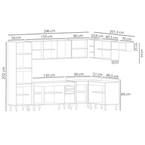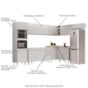 Conteúdo da Embalagem: 1 Balcão 150cm, 1 Balcão 80cm, 1 Armário Aéreo 150cm, 1 Armário Aéreo 80cm, 1 Armário Aéreo 70cm, 1 Balcão de Canto, 1 Armário Aéreo de Canto, 1 Paneleiro.
