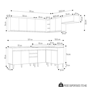 Conteúdo da Embalagem: 1 Balcão 120cm, 1 Armário Aéreo 120cm, 1 Armário Aéreo 70cm, 1 Armário Aéreo 80cm, 1 Balcão 80cm, 1 Balcão de canto, 1 Armário Aéreo de Canto.