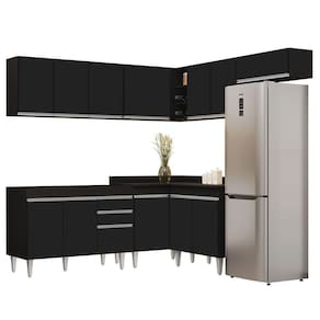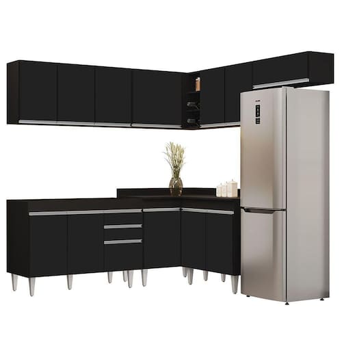 Você merece uma cozinha prática e funcional! Com o Armário de Cozinha Modulado de Canto 7 Peças CP19 Balcão sem Tampo Preto, da Lumil, você terá tudo o que precisa ao seu alcance. Composto por 7 peças inteligentemente projetadas com balcão para pia, armários aéreos, nicho garrafeiro, balcão de canto, e balcão 2 portas, esse armário modulado oferece uma interna perfeita para organizar todos os seus utensílios. Além disso, o acabamento BP confere a esse jogo de cozinha completo uma maior resistência contra riscos e umidade, garantindo sua durabilidade por muito tempo. Já os pés ajustáveis permitem que você nivelar o móvel em qualquer tipo de piso. Para completar, o design contemporâneo dessa cozinha de canto se adapta facilmente a qualquer estilo de decoração, ao passo que a configuração de canto otimiza a circulação no ambiente. Então, aproveite cada centímetro do seu espaço com esse armário de cozinha versátil e funcional. Invista em qualidade e praticidade para sua cozinha hoje mesmo! ESPECIFICAÇÕESDimensões do Produto: Largura: Superior: 210 x 201,3 cm/ Inferior: 207 x 131,5 cm. Altura: 202 cm. Profundidade: Superior: 29 cm / Inferior: 50 x 51 cm. Peso Total: 170 Kg. **NÃO ACOMPANHA PIA INOX. Outras medidas: (Largura x Altura x Profundidade): Balcão Gabinete 120cm Michigan: 117 x 83 x 50 cm. Balcão 80cm Florida: 80,5 x 89 x 51 cm. Balcão de Canto Denver: 90 x 89 x 51 cm. Armário Aéreo 120cm Virgínia: 120 x 54 x 29 cm. Armário Aéreo 70cm Texas: 70 x 25 x 29 cm. Armário Aéreo 80cm Califórnia: 80,5 x 54 x 29 cm. Armário Aéreo de Canto Austin: 90 x 54 x 50,8 cm. Características do Produto: Material da Estrutura: MDP 15 mm. Material do fundo: MDF 3mm. Peso Suportado: 173 kg distribuídos. Acabamento: Melamina BP. Escala de brilho: Fosco. Possui Tampo: Sim. Possui Pia: Não. Possui Portas: Sim. Material da Porta: MDP. Quantidade de Portas: 13 Portas. Tipo de dobradiças: Metálicas. Tipo de Porta: 12 Convencional, 1 Basculante. Possui Gavetas: Sim. Material da Gaveta: MDP. Quantidade de Gavetas: 2 Gavetas. Tipo de corrediças: Metálicas. Possui Nichos: Sim. Quantidade de Nichos: 3 Nichos. Tipo de puxador: Alumínio. Possui Pés: Sim. Diferenciais: - Amplo espaço interno. - Puxadores em alumínio. - Design moderno. - Pés Reguláveis em PVC. - Tampo somente no balcão de canto e balcão 2 portas. Sistema de Montagem: Parafusos e Cavilhas. Manual de Montagem: Sim. Complexidade da Montagem: Alta. Conteúdo da Embalagem: 1 Balcão 120cm, 1 Armário Aéreo 120cm, 1 Armário Aéreo 70cm, 1 Armário Aéreo 80cm, 1 Balcão 80cm, 1 Balcão de canto, 1 Armário Aéreo de Canto. Garantia do Fabricante: 90 dias contra defeitos de fabricação. Volumes: 7 Volumes. Montagem: Recomendamos que seja feita por um . Recomendação de Limpeza: Utilize pano levemente úmido. Observações importantes: - Produto para uso residencial em ambiente interno, não devendo ficar exposto diretamente ao sol, calor e umidades excessivas. - Pode haver alguma diferença de tonalidade entre a imagem e o produto real, por conta do tratamento de imagens e a calibração de cores do seu monitor. - As imagens são meramente ilustrativas, não acompanham objetos de decoração e eletrônicos. - Ao receber a mercadoria, o cliente deve verificar as condições da embalagem, caso haja alguma não assine o de . - Montagem, desmontagem e outras instalações serão de responsabilidade do cliente. Não nos responsabilizamos, no ato da , por subir escadas/elevadores ou pelo por guincho em apartamentos. Eventuais despesas são de responsabilidade do comprador. - Confira as dimensões do produto e certifique-se de que passará normalmente por supostos elevadores, portas, escadas e/ou corredores de sua residência.