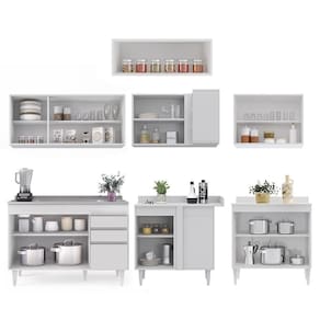 Conteúdo da Embalagem: 1 Balcão 120cm, 1 Armário Aéreo 120cm, 1 Armário Aéreo 70cm, 1 Armário Aéreo 80cm, 1 Balcão 80cm, 1 Balcão de canto, 1 Armário Aéreo de Canto, 1 Pia Inox 120cm.
