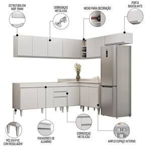 Conteúdo da Embalagem: 1 Balcão 150cm, 1 Armário Aéreo 150cm, 1 Armário Aéreo 70cm, 1 Armário Aéreo 80cm, 1 Balcão 80cm, 1 Balcão de canto, 1 Armário Aéreo de Canto.