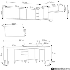 Conteúdo da Embalagem: 1 Balcão 150cm, 1 Armário Aéreo 150cm, 1 Armário Aéreo 70cm, 1 Armário Aéreo 80cm, 1 Balcão 80cm, 1 Balcão de canto, 1 Armário Aéreo de Canto, 1 Tampo 150cm.