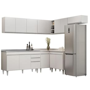 Conteúdo da Embalagem: 1 Balcão 150cm, 1 Armário Aéreo 150cm, 1 Armário Aéreo 70cm, 1 Armário Aéreo 80cm, 1 Balcão 80cm, 1 Balcão de canto, 1 Armário Aéreo de Canto, 1 Pia Inox.