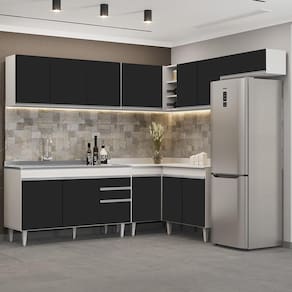Conteúdo da Embalagem: 1 Balcão 150cm, 1 Armário Aéreo 150cm, 1 Armário Aéreo 70cm, 1 Armário Aéreo 80cm, 1 Balcão 80cm, 1 Balcão de canto, 1 Armário Aéreo de Canto, 1 Pia Inox.