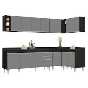 Renove a sua cozinha com o Armário de Cozinha Modulado de Canto 7 Peças CP35 Balcão com Tampo Preto/Cinza, da Lumil, você terá tudo o que precisa ao seu alcance. Composto por 7 peças inteligentemente projetadas, esse armário modulado oferece uma distribuição interna perfeita para organizar todos os seus utensílios. Além de ser composto por peças essenciais, como balcão gabinete com tampo, armários aéreos, balcão de canto com nicho garrafeiro e balcão 2 portas, esse jogo de cozinha completo ainda conta com uma maior resistência contra riscos e umidade, garantindo sua durabilidade por muito tempo, graças ao acabamento em BP. Já os pés ajustáveis permitem você nivelar o móvel em qualquer tipo de piso. Para completar, o design contemporâneo dessa cozinha de canto se adapta facilmente a qualquer estilo de decoração, ao passo que a configuração de canto otimiza a circulação no ambiente. Então, aproveite cada centímetro do seu espaço com esse armário de cozinha versátil e funcional. Invista em qualidade e praticidade para sua cozinha hoje mesmo! ESPECIFICAÇÕESDimensões do Produto: Largura: Superior: 270 x 131,3 cm/ Inferior: 267 x 131,5 cm. Altura: 202 cm. Profundidade: Superior: 29 cm / Inferior: 50 x 51 cm. Peso Total: 174 kg. **NÃO ACOMPANHA PIA INOX. Outras medidas: (Largura x Altura x Profundidade): Balcão Gabinete 180cm Dallas: 177 x 83 x 50 cm. Balcão 80cm Florida: 80,5 x 89 x 51 cm. Balcão de Canto Denver: 90 x 89 x 51 cm. Armário Aéreo 160cm Nevada: 160 x 54 x 29 cm. Armário Aéreo 80cm Califórnia: 80,5 x 54 x 29 cm. Armário Aéreo de Canto Austin: 90 x 54 x 50,8 cm. Nicho Riad: 20 x 54 x 27 cm. Tampo para Balcão Gabinete: 180 x 8,5 x 50,5 cm. Características do Produto: Material da Estrutura: MDP 15 mm. Material do fundo: MDF 3mm. Peso Suportado: 180 kg distribuídos. Acabamento: Melamina BP. Escala de brilho: Fosco. Possui Tampo: Sim. Possui Pia: Não. Possui Portas: Sim. Material da Porta: MDP. Quantidade de Portas: 14 Portas. Tipo de dobradiças: Metálicas. Tipo de Porta: Convencional. Possui Gavetas: Sim. Material da Gaveta: MDP. Quantidade de Gavetas: 2 Gavetas. Tipo de corrediças: Metálicas. Possui Nichos: Sim. Quantidade de Nichos: 6 Nichos. Tipo de puxador: Alumínio. Possui Pés: Sim. Diferenciais: - Amplo espaço interno. - Puxadores em alumínio. - Design moderno. - Pés Reguláveis em PVC. - Todos os balcões acompanham tampo. Sistema de Montagem: Parafusos e Cavilhas. Manual de Montagem: Sim. Complexidade da Montagem: Alta. Conteúdo da Embalagem: 1 Balcão 180cm, 1 Armário Aéreo 160cm, 1 Armário Aéreo 80cm, 1 Balcão 80cm, 1 Balcão de canto, 1 Armário Aéreo de Canto, 1 Nicho, 1 Tampo 180cm. Garantia do Fabricante: 90 dias contra defeitos de fabricação. Volumes: 8 Volumes. Montagem: Recomendamos que seja feita por um . Recomendação de Limpeza: Utilize pano levemente úmido. Observações importantes: - Produto para uso residencial em ambiente interno, não devendo ficar exposto diretamente ao sol, calor e umidades excessivas. - Pode haver alguma diferença de tonalidade entre a imagem e o produto real, por conta do tratamento de imagens e a calibração de cores do seu monitor. - As imagens são meramente ilustrativas, não acompanham objetos de decoração e eletrônicos. - Ao receber a mercadoria, o cliente deve verificar as condições da embalagem, caso haja alguma não assine o comprovante de recebimento. - Montagem, desmontagem e outras instalações serão de responsabilidade do cliente. Não nos responsabilizamos, no ato da , por subir escadas/elevadores ou pelo transporte por guincho em apartamentos. Eventuais despesas são de responsabilidade do comprador. - Confira as dimensões do produto e certifique-se de que passará normalmente por supostos elevadores, portas, escadas e/ou corredores de sua residência.