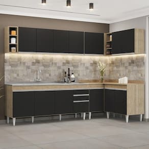 Além de ser composto por peças essenciais, como balcão gabinete com pia, armários aéreos, balcão de canto com nicho garrafeiro e balcão 2 portas, esse jogo de cozinha completo ainda conta com uma maior resistência contra riscos e umidade, garantindo sua durabilidade por muito tempo, graças ao acabamento em BP. Já os pés ajustáveis permitem você nivelar o móvel em qualquer tipo de piso. Para finalizar, a pia inox completa a funcionalidade, enquanto o design contemporâneo dessa cozinha de canto harmoniza facilmente com qualquer estilo de decoração e otimiza a circulação no ambiente.