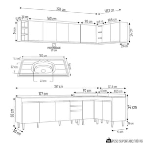 Conteúdo da Embalagem: 1 Balcão 180cm, 1 Armário Aéreo 160cm, 1 Armário Aéreo 80cm, 1 Balcão 80cm, 1 Balcão de canto, 1 Armário Aéreo de Canto, 1 Nicho, 1 Pia Inox 180cm.