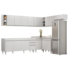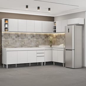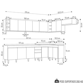 Conteúdo da Embalagem: 1 Balcão 180cm, 1 Armário Aéreo 160cm, 1 Armário Aéreo 70cm, 1 Armário Aéreo 80cm, 1 Balcão 80cm, 1 Balcão de canto, 1 Armário Aéreo de Canto, 1 Nicho.