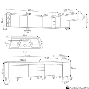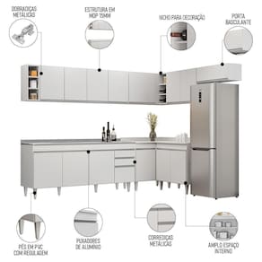 Conteúdo da Embalagem: 1 Balcão 180cm, 1 Armário Aéreo 160cm, 1 Armário Aéreo 70cm, 1 Armário Aéreo 80cm, 1 Balcão 80cm, 1 Balcão de canto, 1 Armário Aéreo de Canto, 1 Nicho, 1 Pia Inox 180m.