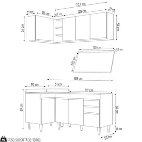 Conteúdo da Embalagem: 1 Balcão 120cm, 1 Armário Aéreo 120cm, 1 Balcão de Canto, 1 Armário Aéreo de Canto, 1 Tampo 120cm.