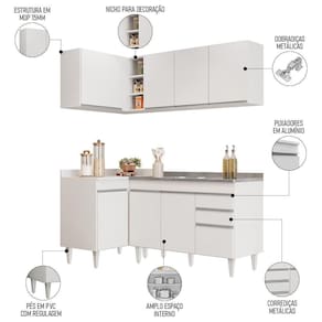 Conteúdo da Embalagem: 1 Balcão 120cm, 1 Armário Aéreo 120cm, 1 Balcão de Canto, 1 Armário Aéreo de Canto, 1 Pia Inox 120cm.