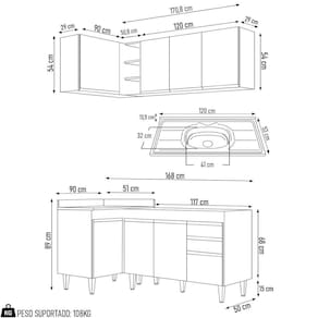 Conteúdo da Embalagem: 1 Balcão 120cm, 1 Armário Aéreo 120cm, 1 Balcão de Canto, 1 Armário Aéreo de Canto, 1 Pia Inox 120cm.
