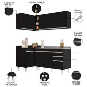 Altura: 202 cm | AssemblyRequired: Sim, sugerimos a contratação do nosso serviço de montagem (para os CEPs em que o serviço está dispon | Color: Preto | ColorFamily: Preto | ColorSimple: Preto | ColorSupplier: Preto | Cor: Preto | Gênero: Unisex | Largura: 261 cm | Manual: Sim | Marca: Mpozenato | Material: MDP | MaterialFamily: MDP | Model: CP 39 | Origem: | OriginCountry: | OriginState: PR | Peso: 114 kg | Peso Suportado: 108 kg | ProductContents: 1 Balcão 120cm, 1 Armário Aéreo 120cm, 1 Balcão de Canto, 1 Armário Aéreo de Canto, 1 Pia Inox 120cm | ProductHeight: 202 | ProductInstructions: Produto para uso em ambiente interno, nao devendo ficar exposto ao sol, calor e umidade excessivos. | ProductLength: 50 | ProductWarranty: 90 dias após o do produto | ProductWeight: 114 kg | ProductWidth: 261 | Profundidade: 50 cm | Requere montagem: Sim | SizeDescription: 202 x 261 x 50 cm | SupplierSimpleName: Armário de Cozinha Modulado de Canto Direito 4 Peças CP39 com Pia Inox Preto - Lumil | Tipo de : Fabricante