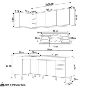 Conteúdo da Embalagem: 1 Balcão 150cm, 1 Armário Aéreo 150cm, 1 Balcão de canto, 1 Armário Aéreo de Canto, 1 Pia Inox 150cm.