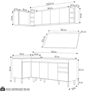 Conteúdo da Embalagem: 1 Balcão 180cm, 1 Armário Aéreo 160cm, 1 Balcão de canto, 1 Armário Aéreo de Canto, 1 Nicho, 1 Tampo 180cm.