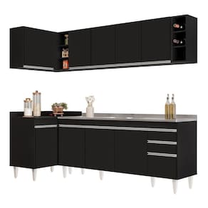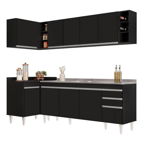 Renove a sua cozinha com o Armário de Cozinha Modulado de Canto Direito 5 Peças CP45 com Pia Inox Preto, da Lumil, você terá tudo o que precisa ao seu alcance. Composto por 5 peças, sendo balcão para pia, armários aéreos, balcão de canto e nicho garrafeiro, esse armário modulado oferece uma interna perfeita para organizar todos os seus utensílios.