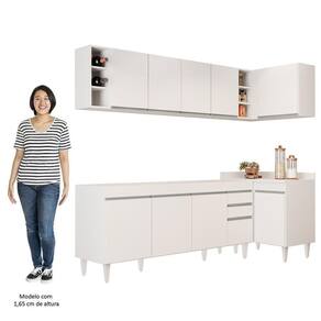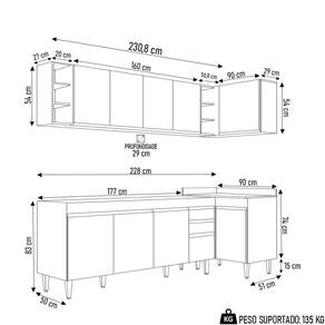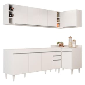 Renove a sua cozinha com o Armário de Cozinha Modulado de Canto Esquerdo 5 Peças CP52 Balcão sem Tampo Branco , da Lumil, você terá tudo o que precisa ao seu alcance. Composto por 5 peças, sendo balcão para pia 180cm, armários aéreos, balcão de canto e nicho garrafeiro , esse armário modulado oferece uma interna perfeita para organizar todos os seus utensílios. Além disso esse jogo de cozinha completo ainda conta com uma maior resistência contra riscos e umidade, garantindo sua durabilidade por muito tempo, graças ao acabamento em BP. Já os pés ajustáveis permitem você nivelar o móvel em qualquer tipo de piso. Para completar, o design contemporâneo dessa cozinha de canto se adapta facilmente a qualquer estilo de decoração, ao passo que a configuração de canto otimiza a circulação no ambiente. Então, aproveite cada centímetro do seu espaço com esse armário de cozinha versátil e funcional. Invista em qualidade e praticidade para sua cozinha hoje mesmo! ESPECIFICAÇÕESDimensões do Produto: Largura: 230,8 x 90 cm. Altura: 202 cm. Profundidade: Superior: 29 cm / Inferior: 51/50 cm. Peso Total: 127 kg. **NÃO ACOMPANHA PIA INOX. Outras medidas: (Largura x Altura x Profundidade): Balcão Gabinete 180cm Dallas: 177 x 83 x 50 cm. Balcão de Canto Denver: 90 x 89 x 51 cm. Armário Aéreo 160cm Nevada: 160 x 54 x 29 cm. Armário Aéreo de Canto Austin: 90 x 54 x 50,8 cm. Nicho Riad: 20 x 54 x 27 cm. Características do Produto: Material da Estrutura: MDP 15 mm. Material do fundo: MDF 3mm. Peso Suportado: 135 kg distribuídos. Acabamento: Melamina BP. Escala de brilho: Fosco. Possui Tampo: Sim. Possui Pia: Não. Possui Portas: Sim. Material da Porta: MDP. Quantidade de Portas: 10 Portas. Tipo de dobradiças: Metálicas. Tipo de Porta: Convencional. Possui Gavetas: Sim. Material da Gaveta: MDP. Quantidade de Gavetas: 2 Gavetas. Tipo de corrediças: Metálicas. Possui Nichos: Sim. Quantidade de Nichos: 6 Nichos. Tipo de puxador: Alumínio. Possui Pés: Sim. Diferenciais: - Amplo espaço interno. - Puxadores em alumínio. - Design moderno. - Montagem Canto Esquerdo. - Pés Reguláveis em PVC. - Balcão de canto com tampo. Sistema de Montagem: Parafusos e Cavilhas. Manual de Montagem: Sim. Complexidade da Montagem: Alta. Conteúdo da Embalagem: 1 Balcão 180cm, 1 Armário Aéreo 160cm, 1 Balcão de canto, 1 Armário Aéreo de Canto, 1 Nicho. Garantia do Fabricante: 90 dias contra defeitos de fabricação. Volumes: 5 Volumes. Montagem: Recomendamos que seja feita por um . Recomendação de Limpeza: Utilize pano levemente úmido. Observações importantes: - Produto para uso residencial em ambiente interno, não devendo ficar exposto diretamente ao sol, calor e umidades excessivas. - Pode haver alguma diferença de tonalidade entre a imagem e o produto real, por conta do tratamento de imagens e a calibração de cores do seu monitor. - As imagens são meramente ilustrativas, não acompanham objetos de decoração e eletrônicos. - Ao receber a mercadoria, o cliente deve verificar as condições da embalagem, caso haja alguma não assine o de . - Montagem, desmontagem e outras instalações serão de responsabilidade do cliente. Não nos responsabilizamos, no ato da , por subir escadas/elevadores ou pelo por guincho em apartamentos. Eventuais despesas são de responsabilidade do comprador. - Confira as dimensões do produto e certifique-se de que passará normalmente por supostos elevadores, portas, escadas e/ou corredores de sua residência.