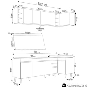 Conteúdo da Embalagem: 1 Balcão 180cm, 1 Armário Aéreo 160cm, 1 Balcão de canto, 1 Armário Aéreo de Canto, 1 Nicho, 1 Tampo 180cm.