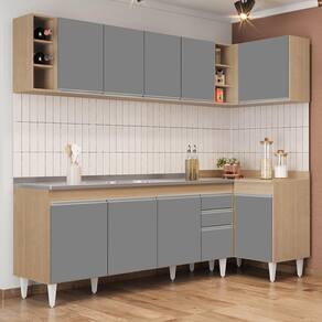 Além disso esse jogo de cozinha completo ainda conta com uma maior resistência contra riscos e umidade, garantindo sua durabilidade por muito tempo, graças ao acabamento em BP. Já os pés ajustáveis permitem você nivelar o móvel em qualquer tipo de piso. Para finalizar, a pia inox completa o design contemporâneo dessa cozinha de canto, deixando-a pronta para experimentar as mais diversas receitas, ao passo que a configuração em L otimiza a circulação no ambiente e cria um ar agradável e convidativo. Demais, não é mesmo?!