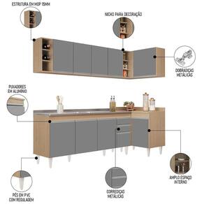 Conteúdo da Embalagem: 1 Balcão 180cm, 1 Armário Aéreo 160cm, 1 Balcão de canto, 1 Armário Aéreo de Canto, 1 Nicho, 1 Pia Inox 180cm.