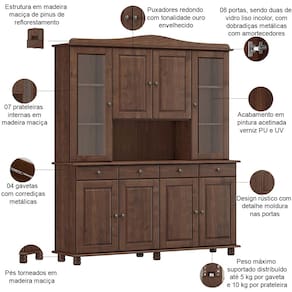 Fabricado em madeira maciça de altíssima qualidade, esse imponente armário com 8 portas (incluindo 2 portas com vidro estilo cristaleira) e 4 gavetas extras oferece um espaço generoso para organizar desde utensílios do dia a dia até coleções especiais de louças e alimentos. Os pés torneados robustos e os puxadores em tonalidade envelhecida reforçam o charme rústico, enquanto os vidros lisos nas portas criam um belo efeito de luz para exibir suas peças mais bonitas. O armário de cozinha rústico perfeito para cozinhas amplas, seja em casas de campo ou até mesmo na cidade, caso você goste de um ar vintage. Seja como for, o armário Lazuli transforma sua cozinha em um espaço digno de fazenda.