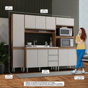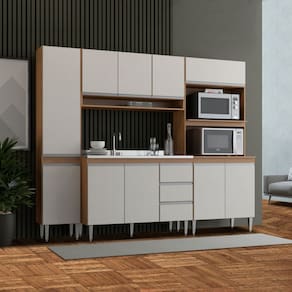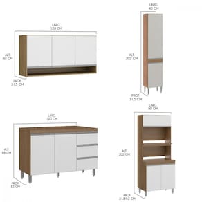 Conteúdo da embalagem 1 paneleiro 40x202x31,5 cm, 1 torre quente 80x202x31,5/52 cm, 1 armário aéreo 120x60x31,5 cm, 1 balcão pia 120x88x52 cm, manual de montagem.