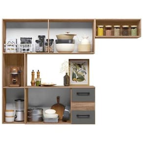 Armario de Cozinha suspenso 7 portas e 2 gavetas Juliete Nicioli A cozinha e o coracao da casa. Entao, nada mais justo que ter um espaco dinamico e organizado de modo a facilitar a rotina. Pensando nisso, a Nicioli criou a Cozinha Suspensa Juliete. Vem com a gente conferir como esse movel pode te ajudar!Nao importa se voce tem uma cozinha pequena, pois por ser um modelo de cozinha suspensa ela e perfeita para a otimizacao do espaco de circulacao e ainda facilita na hora da limpeza. Alem disso, possui otima divisao interna, o que contribui para dispor cada objeto em seu devido lugar. Sem contar que voce podera apostar em itens decorativos sobre o balcao com tampo ou ate mesmo deixar os eletrodomesticos a vista. Ai, vai do seu gosto e imaginacao.Nao perca tempo, tenha dias mais faceis com a Cozinha Compacta Suspensa Juliete. Medidas da Cozinha Juliete:Altura: 136 cmLargura: 180 cmProfundidade: 29 cm Caracteristicas:Medidas Internas (L x A x P)Balcao: 58 x 45,5 x 33 cmNicho Geladeira: 57,5 x 21 x 29 cmMaterial da Estrutura: MDP07 portas02 gavetas com corredicas metalicas02 NichosDesign suspenso.Amplo espaco interno.Limpeza com pano macio e levemente umedecido, nao utilizar material aspero. Nao utilizar solventes a base e de inflamaveis.Produto necessita montagem. Nao nos responsabilizamos pela montagem incorreta do produto.A garantia do produto e fornecida pelo fabricante durante 3 meses contra defeito de fabricacao. Mau uso ou montagem incorreta NAO estao inclusos.