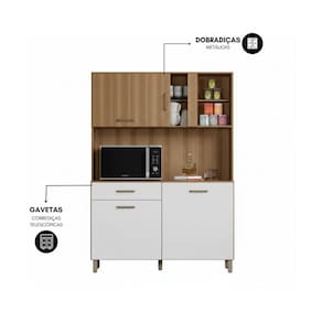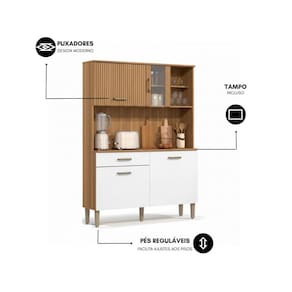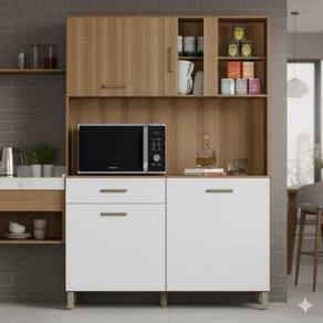 Este armário inclui prateleiras bem distribuídas que maximizam o espaço vertical, permitindo a organização eficiente de louças, copos e mantimentos. A superfície inferior oferece um tampo prático para apoio ou para acomodar seus utensílios domésticos.