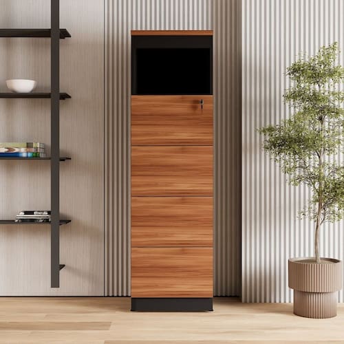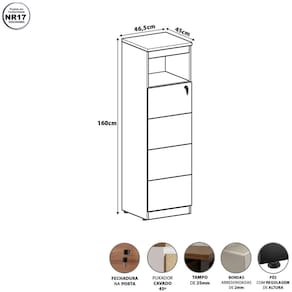 Altura: 160 cm Acabamento da Gaveta: BP Acabamento dos Pés: Pintura Ambiente Principal: Escritório Armário Suspenso: Não codigo_ean: 7900288257130 Complexidade da Montagem: Média: pode ser montado por mais de uma pessoa e/ou necessite de maior conhecimento para montagem Cor: Nogal / Preto Cor do Produto: Nogal / Preto Cor Flex: Não Cor Interna: Marrom Escala de Brilho: Fosco Espessura do Tampo: 25 mm Formato do Armário: Retangular Gaveta com Chave: 01 Itens Inclusos: 1 Armário, Kit Ferragens e Manual da Montagem. Linha ou Coleção: Corporate Localização do Nicho: Nicho em Cima Manual de Montagem e Instalação: https://product-hub-prd.madeiramadeira.com.br/481557696/documents/9dc43602-c021-49a3-bde7-9e5f413f5714326730165951760009622603.pdf Marca: F5 Office Material da Gaveta: MDP Material dos Pés: Metal Material Principal: MDP Montagem Flex: Não, o produto só pode ser montado conforme a imagem. Necessita Montagem: Sim Orientação do Armário: Vertical Origem do Produto: Nacional Pés Reguláveis: Sim Peso: 52 kg Peso Máximo por Gaveta: 15 kg Possui Espelho: Não Possui Mesa Retrátil: Não Possui Nicho: Sim Possui Pés: 04 Possui Portas: Não Possui Prateleiras: Não Quantidade de Armários: 1 Recomendações de Uso, Manutenção e Limpeza: Para uma limpeza mais efetiva, utilizar apenas pano macio e sabão neutro. Não utilizar produtos abrasivos. Sapatas Niveladoras: Sim Sistema de Montagem: Parafusos e buchas metálicas. Suporta Até (kg): 80 kg Tamanho do Armário: Alto (Acima de 150cm) Tipo de Armário: Totalmente Fechado Tipo de Corrediça da Gaveta: Metálica Telescópica Tipo de Puxador da Gaveta: Embutido Marca: Não Informado