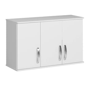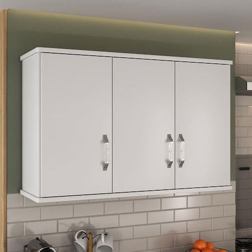 * Imagens meramente ilustrativas. Armário aéreo de 3 portas para ser fixado na parede. Ideal para utilização em pequenas cozinhas, , lavanderias escritórios, consultórios e etc. Possui 3 prateleiras internas removíveis, sendo 2 maiores no lados das portas que formam par e outra menor na porta esquerda. Esta prateleira esquerda pode ser colocada na furação mais acima ou mais abaixo, conforme a necessidade do cliente. - Dobradiças metálicas; - Corpo em MDP 15mm de espessura; - Acabamento Fosco Texturizado; - Inclusas as ferragens para fixação na parede (cantoneiras de aço e parafusos com buchas). Dimensões do produto montado: altura 65 cm largura 101 cm profundidade 35 cm Produto entregue desmontado. Manual de montagem disponível no site do fabricante. Atenção: Não nos responsabilizamos, no ato da entrega, por desmontagens, subir escadas/elevadores ou transporte por guincho para apartamentos. Eventuais despesas são de responsabilidade do cliente. Confira as dimensões deste produto e certifique-se de que o mesmo passará normalmente por supostos elevadores, portas, escadas e/ou corredores de sua moradia.