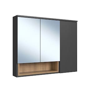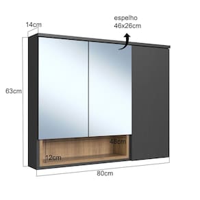- Cor: Marrom/Grafite - Dimensões montado (AxLxP): 63 x 80 x 14 cm - Peso montado: 12,9 kg - Material: MDP 15 mm com acabamento fosco - Espelhos inclusos: 2 unidades – 46,5 x 26 cm (espessura: 3 mm) - Prateleiras internas: 3 (espessura: 1,5 cm | suporta até 10 kg cada) - Portas: 3 de bater com dobradiças metálicas - Capacidade total de peso: até 10 kg - Fixação na parede: Sim, obrigatória - Limpeza recomendada: Pano levemente umedecido com água.