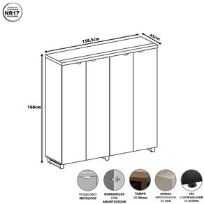 Altura: 160 cm Acabamento da Porta: BP Acabamento da Prateleira: BP Acabamento dos Pés: Pintura Ambiente Principal: Escritório Armário Suspenso: Não codigo_ean: 7900288244185 Complexidade da Montagem: Média: pode ser montado por mais de uma pessoa e/ou necessite de maior conhecimento para montagem Cor: Nogal com Preto Cor do Produto: Nogal com Preto Cor Flex: Não Cor Interna: Preto Escala de Brilho: Fosco Escala de Brilho da Porta: Fosco Escala de Brilho da Prateleira: Fosco Espessura do Tampo: 40 mm Formato do Armário: Retangular Itens Inclusos: 1 Armário Alto, Kit Ferragens e Manual da Montagem. Linha ou Coleção: Coleção Corporate F5 Office Localização do Nicho: Nicho em Cima Manual de Montagem e Instalação: https://product-hub-prd.madeiramadeira.com.br/558289929/documents/fba8865a-2704-4cf7-9441-551cc3a339f23250186659517592490054235.pdf Marca: F5 Office Material da Porta: Metal Material da Prateleira: MDP Material do Puxador da Porta: Metal Material dos Pés: Metal Material Principal: MDP Montagem Flex: Não, o produto só pode ser montado conforme a imagem. Necessita Montagem: Sim Orientação do Armário: Vertical Origem do Produto: Nacional Pés Reguláveis: Sim Peso: 79 kg Peso Máximo por Prateleira: 10 kg Possui Espelho: Não Possui Mesa Retrátil: Não Possui Nicho: Sim Possui Pés: 03 Possui Portas: 08 Possui Prateleiras: 04 Quantidade de Armários: 1 Recomendações de Uso, Manutenção e Limpeza: Para uma limpeza mais efetiva, utilizar apenas pano macio e sabão neutro. Não utilizar produtos abrasivos. Sapatas Niveladoras: Sim Sistema de Montagem: Parafusos e buchas metálicas. Suporta Até (kg): 80 kg Tamanho do Armário: Alto (Acima de 150cm) Tipo de Armário: Semi-Fechado Tipo de Dobradiça/Corrediça da Porta: Metálica Tipo de Puxador da Porta: Externo Marca: Não Informado