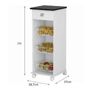 Armário Auxiliar Fruteira Talita 1 Gaveta e 3 Cestos BrancaA Fruteira Talita possui 1 gaveta com corrediças metálicas, 3 cestos metálicos feitos com pintura eletrostática que não encardem e não enferrujam, fáceis de limpar.Ideal para armazenamento de frutas e legumes, possui rodízios para uma melhor movimentação e facilidade de limpeza.Pode ser utilizado para áreas de cozinha e lavanderia. Esse móvel é ideal para pessoas que gostam de organização.Produzido em MDP conta com um design sofisticado irá harmonizar com seu ambiente de casa. Além disso, o produto possui uma fácil montagem.Marca: Quarta DivisãoModelo: TalitaAltura 100 cmLargura 38 cmProfundidade 37 cm