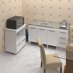 Características Balcão de Pia Carina 138 cm: Altura:83,5 cm (Com os Pés). Altura sem os pés: 67 cm. Largura: 138 cm (Padrão para pia de 140 cm). Profundidade: 50 cm. Material: MDP (madeira). Portas: 3 Portas. Gavetas: 3 Gaveta. Prateleiras: 1 Prateleira. Puxadores: 6 puxadores plásticos cromados Pés: 6 pés reguláveis de plástico. Altura dos pés:16,5 cm Regulagem dos pés: Somente para nivelamento, (Chega no máximo a 18 cm). Corrediças: Metálicas. Acompanha tampo: Não Indicações de Uso: Cozinha