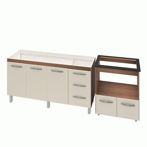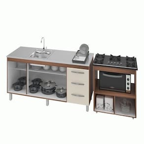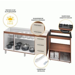 Características do kit montado: Largura 213 cm (lado a lado os dois balcões). Profundidade: 50 cm Altura: 85,5 cm (Altura do balcão para cooktop com tampo) *Imagem meramente ilustrativa, não acompanha objetos decorativos, é somente os dois balcões.