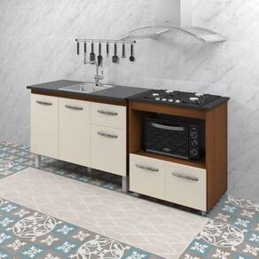Armário Gabinete Pia De 120 Cm Anitta Com Balcão Cooktop 4 Bocas E Forno Elisa Savana Frente Off-white Boa parte do nosso tempo passamos na cozinha né? Por isto ela precisa ser um ambiente bonito e agradável! Pensando nisso, apresentamos o kit Balcão para Pia 118 cm Anitta com Balcão para Cooktop 4 bocas e Forno Elétrico Elisa da Moblis Móveis, um kit com a sua cara! Ele é bonito, moderno, combina com cada detalhe da sua cozinha e vai te surpreender, adquira já o seu! Características Balcão de Pia Anitta 118 cm: Altura:83,5 cm (Com os Pés). Altura sem os pés: 67 cm. Largura: 118 cm (Padrão para pia de 120 cm). Profundidade: 50 cm. Material: MDP (madeira). Portas: 3 Portas. Gavetas: 1 Gaveta. Prateleiras: 1 Prateleira. Puxadores: 4 puxadores plásticos cromados Pés: 5 pés reguláveis de plástico. Altura dos pés:16,5 cm Regulagem dos pés: Somente para nivelamento, (Chega no máximo a 18 cm). Corrediças: Metálicas. Acompanha tampo: Não Características Balcão Para Cooktop Elisa 4 Bocas: Altura: 85,5 cm (Altura do produto com os pés e com o tampo) Altura sem os pés: 80,5 cm Largura: 75 cm Profundidade: 50 cm *A largura 75 cm corresponde ao tampo do balcão, sem o tampo o balcão tem 71 cm de Largura. Dimensões do Nicho (Recorte para encaixar o cooktop): 53 x 36 cm Material: MDP Portas: 2 Portas Puxadores: 2 puxadores plásticos cromados Pés: 4 pés de plástico. Altura dos pés: 5 cm Regulagem dos pés: Não tem regulagem. Acompanha tampo: Sim (Somente o Balcão de Cooktop). Características do kit montado: Largura 193 cm (lado a lado os dois balcões). Profundidade: 50 cm Altura: 85,5 cm (Altura do balcão para cooktop com tampo) *Imagem meramente ilustrativa, não acompanha objetos decorativos, é somente os dois balcões.