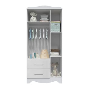 Possui 3 portas lisas, cabideiro metálico para pendurar roupas de forma organizada e 2 gavetas amplas com corrediças telescópicas metálicas para abertura suave e silenciosa. Os puxadores, fabricados em MDF revestido com papel melamínico, proporcionam durabilidade e beleza. O produto acompanha dois modelos de rodapés (reto ou usinado/torneado), permitindo personalizar o visual durante a montagem.