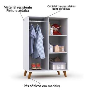 Transforme o Quarto do seu Bebê com nosso Armário infantil! Combinação ideal de estilo e funcionalidade. Conta com 2 portas clássicas, que dão acesso ao espaço interno, com divisões inteligentes para que você possa guardar as roupas e itens de seu bebê, 1 cabideiro, 2 prateleiras, e puxadores no estilo Ponto Toro, deixando seu ambiente ainda mais sofisticado. O produto ainda conta com pés cônicos resistentes e retrô, para trazer ainda mais beleza para o quarto de seu filho. Feito com materiais de qualidade, e pintura atóxica trazendo ainda mais resistência e durabilidade.