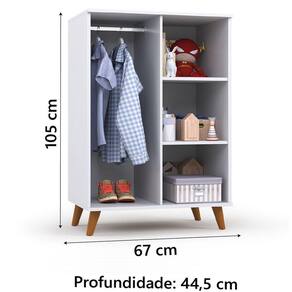 MEDIDAS:: [ A ] = 105 cm [ L ] = 67 cm [ P ] = 44,5 cm | MEDIDA DOS PÉS:: [ A ] = 12 cm [ L ] = 5 cm | PESO:: 26,2 kg | PESO SUPORTADO:: 25 kg | PRATELEIRAS SUPORTAM ATÉ:: 5 kg | CABIDEIRO SUPORTA ATÉ:: 5 kg | NOME:: Armário Infantil Organizador Para Quarto Bebê 2 Portas Madeirado / Branco Batrol | MARCA:: Batrol | MATERIAL DA ESTRUTURA:: MDP | ESPESSURA DO MATERIAL DA ESTRUTURA:: 12 e 15mm | ACABAMENTO:: Pintura UV | PORTAS:: 2 | TIPO DE PORTA:: Bater | PRATELEIRAS:: 2 | CABIDEIRO:: Alumínio | PUXADORES:: Plástico | DOBRADIÇAS:: Metálicas | PÉS:: 4 unidades, cônicos | MATERIAL DOS PÉS:: Madeira | DIFERENCIAL:: Pintura atóxica trazendo ainda mais resistência e durabilidade a vida útil do produto. | GARANTIA:: 3 meses | ITENS INCLUSOS:: 1 Armário Infantil, 1 Manual de Montagem, 1 Kit Parafusos- | INSTRUÇÕES E CUIDADOS:: Para maior durabilidade, recomendável que a limpeza dos móveis seja feita com pano limpo e levemente umedecido em água e sabão neutro. Em seguida, deverá ser passado um pano limpo e seco. | AVISO:: A Esplanada Móveis se responsabiliza pela dos produtos adquiridos até a porta de entrada ou portaria do endereço indicado, se a portaria do condomínio permitir, as s são efetuadas no piso térreo e é de responsabilidade do cliente Cor: Branco