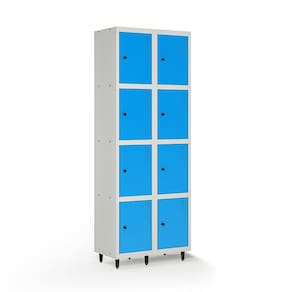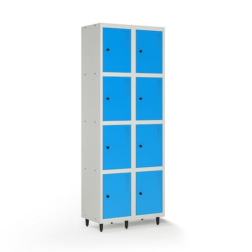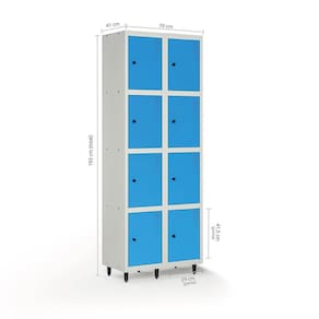 Fabricado em chapa de aço nº 26 (0,045cm), o roupeiro conta com 8 portas individuais, tratamento anticorrosão e pintura eletrostática a pó.