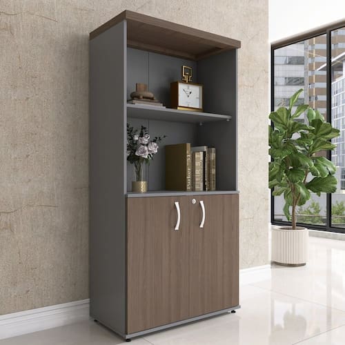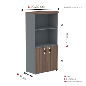 Possui 2 portas pivotantes com fechadura e chave, oferecendo proteção para documentos, materiais e objetos pessoais. Seu interior é versátil, com parte equipada com prateleiras para melhor organização e espaço livre para itens maiores.