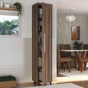 * Imagens meramente ilustrativas. Armário multiuso e multi-ambiente, possui 1 porta e 5 prateleiras internas, sendo 4 delas móveis e apenas a do meio fixa. Muito comumente é utilizado como sapateira, guarda-roupa infantil, para guardar mantimentos, produtos de limpeza ou no escritório. - 6 Espaços dividido por prateleiras para organizar melhor os objetos; - Acabamento Fosco Texturizado; - Dobradiças Metálicas; - Rodízios com chapa de ferro; - Puxador cromado. Dimensões do produto montado: Altura 182 cm Largura 34 cm Profundidade 39 cm. Produto entregue desmontado. Acompanha manual de montagem que também está disponível no site do fabricante. Perguntas frequentes: 1) Qual a capacidade suportada? RESP 1) Suporta até 25kg por prateleira e até 200kg total no produto. 2) As prateleiras são reguláveis? RESP 2) Não, as prateleiras não são reguláveis. A prateleira central é fixa inclusive. As demais poodem ser removidas se necessário. 3) O produto vem montado ou desmontado? RESP 3) O móvel é entregue desmontado, com kit de ferragens e manual de montagem. O de montagem de móveis pode ser oferecido adicionalmente ao simular o para sua (se disaponível a vai informar). 4) É em MDF? RESP 4) Não. O produto é em MDP 15mm revestido com BP. 5) Posso mudar as medidas? RESP 5) Não pode. Atenção: Não nos responsabilizamos, no ato da , por desmontagens, subir escadas/elevadores ou por guincho para apartamentos. Eventuais despesas são de responsabilidade do cliente. Confira as dimensões deste produto e certifique-se de que o mesmo passará normalmente por supostos elevadores, portas, escadas e/ou corredores de sua moradia.