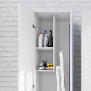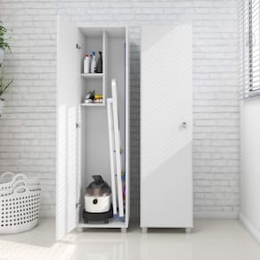 Armário Multiuso Tecnomobili AM3107, possui 1 porta, 2 nichos, local para guardar vassoura, aspirador de pó e/ou baldes, amplo espaço para organização na cozinha e/ ou área de serviço, estrutura em MDP, acabamento em pintura UV. Acabamento da Porta: Pintura UV Acabamento da Prateleira: Pintura UV Acabamento dos Pés: Polipropileno Complexidade da Montagem: Baixa: pode ser montado por uma pessoa sozinha Cor do Produto: Branco Cor Interna: Branco Escala de Brilho: Semi-Brilho Escala de Brilho da Porta: Semi-Brilho Escala de Brilho da Prateleira: Semi-Brilho Informações Complementares: Nichos 3kg cada Itens Inclusos: 1 Armário Multiuso e Kit Ferragens. Linha ou Coleção: Cozinha / Área de serviço Material da Porta: MDP Material da Prateleira: MDP Material do Puxador da Porta: Plástico Material dos Pés: Polipropileno Material Principal: MDP Necessita Montagem: Sim Pés Reguláveis: Não Peso: 21 kg Peso Máximo por Prateleira: 3 kg Possui Pés: 04 Possui Portas: 01 Recomendações de Uso, Manutenção e Limpeza: Utilizar somente pano úmido e sabão neutro. Sapatas Niveladoras: Sim Sistema de Montagem: Montar o móvel deitado de costas. Forrar o chão com o papelão das embalagens, aconselhamos a ser feita por um profissional, não expor o móvel a fontes de calor ou de umidade. Suporta Até (kg): 20 kg Tipo de Dobradiça/Corrediça da Porta: Metálica Tipo de Porta: Bater Tipo de Puxador da Porta: Externo