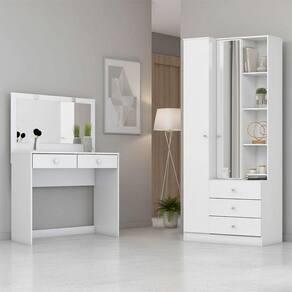 Deixe seu cantinho de beleza ainda mais completo com este lindo kit que preparamos para você. Apresentamos o Armário Multiuso Doha e a Penteadeira Daila com Led, desenvolvidos pela Henn. Multiuso com espelho, 2 portas, puxadores pontuais, combinando perfeitamente com a Penteadeira Daila, que possui Led, 2 gavetas com corrediças metálicas e design moderno. Confira mais detalhes e aproveite!