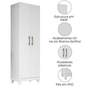 Armário Multiuso New Iris, desenvolvido para otimizar ambientes compactos com praticidade e estilo. Estrutura em MDP (15 mm/12 mm) com acabamento em pintura UV. Internamente, dispõe de prateleiras bem distribuídas. Equipado com 2 portas com dobradiças metálicas e dupla opção de montagem: pés em PVC ou sapatas niveladoras. Este produto será entregue em 01 volume.