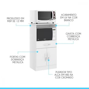 Armário Multiuso Nicho Forno Micro 62x111cm Mdp Menu Móveis Branco O Armario Multiuso e um movel versatil e util, perfeito para otimizar o seu ambiente e atender todas as suas necessidades do dia a dia com muita funcionalidade. Dispoe de um design atual e muito espaco interno para armazenar mantimentos e utensilios. Alem disso possui nicho para forno e micoondas, duas portas e uma gaveta. O Armario e produzido com materiais de excelente qualidade, garantindo a durabilidade e vida util. O melhor em moveis no design atual aliando conforto, qualidade e otimos precos, so na Menu Moveis! Caracteristicas: Produzido em MDP de 12 mm Acabamento UV Porta com Dobradica Metalica Gaveta com Corredica Metalica Puxador tipo Alca em ABS