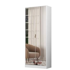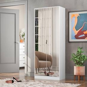 Móvel que embeleza e amplia o ambiente devido à grande área de espelhos nas portas; prateleiras ideais para acomodação de vários pares de sapatos além de uma gaveta interna para pequenos pertences com deslize em corrediça telescópica. Puxadores discretos em alumínio.