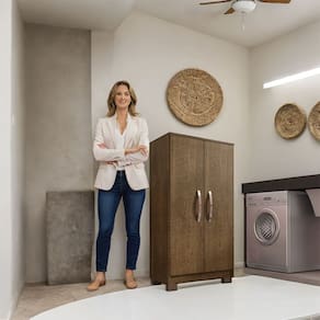 Os pés plásticos na cor mel ajudam a manter o armário elevado, facilitando a limpeza do chão e protegendo a base do móvel da umidade comum em lavanderias. Fácil de montar, ele conta com sistema por parafusos, cavilhas, cantoneiras e porcas cilíndricas.